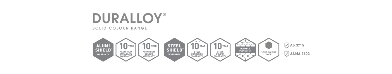 The Duralloy solid colour range is a collection of popular solid colours including Colorbond® colours, delivered with warranty grade advanced durable polyester thermosetting powder.