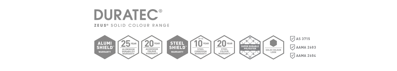 The Duratec Zeus solid colour range is a collection of on trend solid colours, delivered with warranty grade* advanced super durable polyester thermosetting powder.