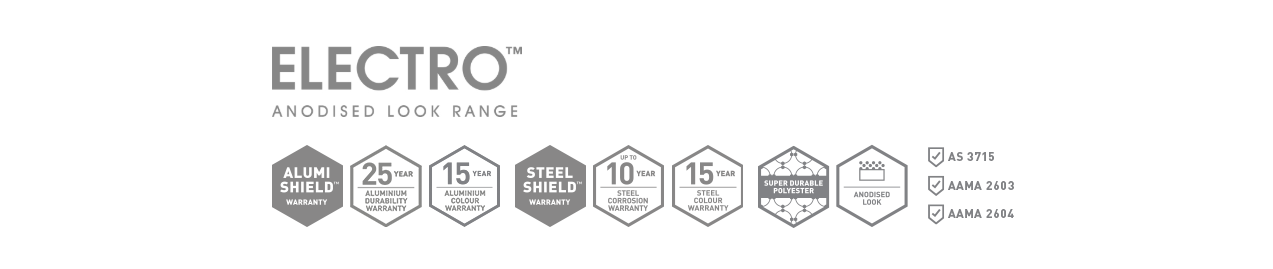 The Electro anodised look range is a collection of unique anodised look finishes, designed to subtly change in appearance as light conditions alter in the day, delivered with warranty grade advanced super durable polyester thermosetting powder.