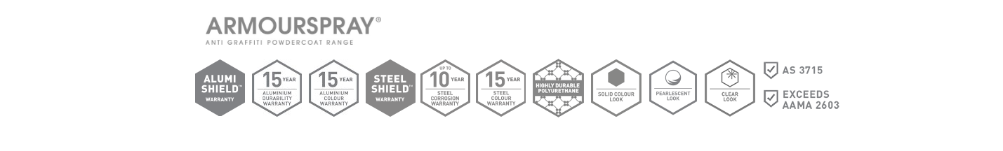 Armourspray is a range of solid, pearlescent and clear finishes with high chemical resistance allowing the removal of most forms of graffiti, delivered with warranty grade advanced highly durable polyurethane thermosetting powder.