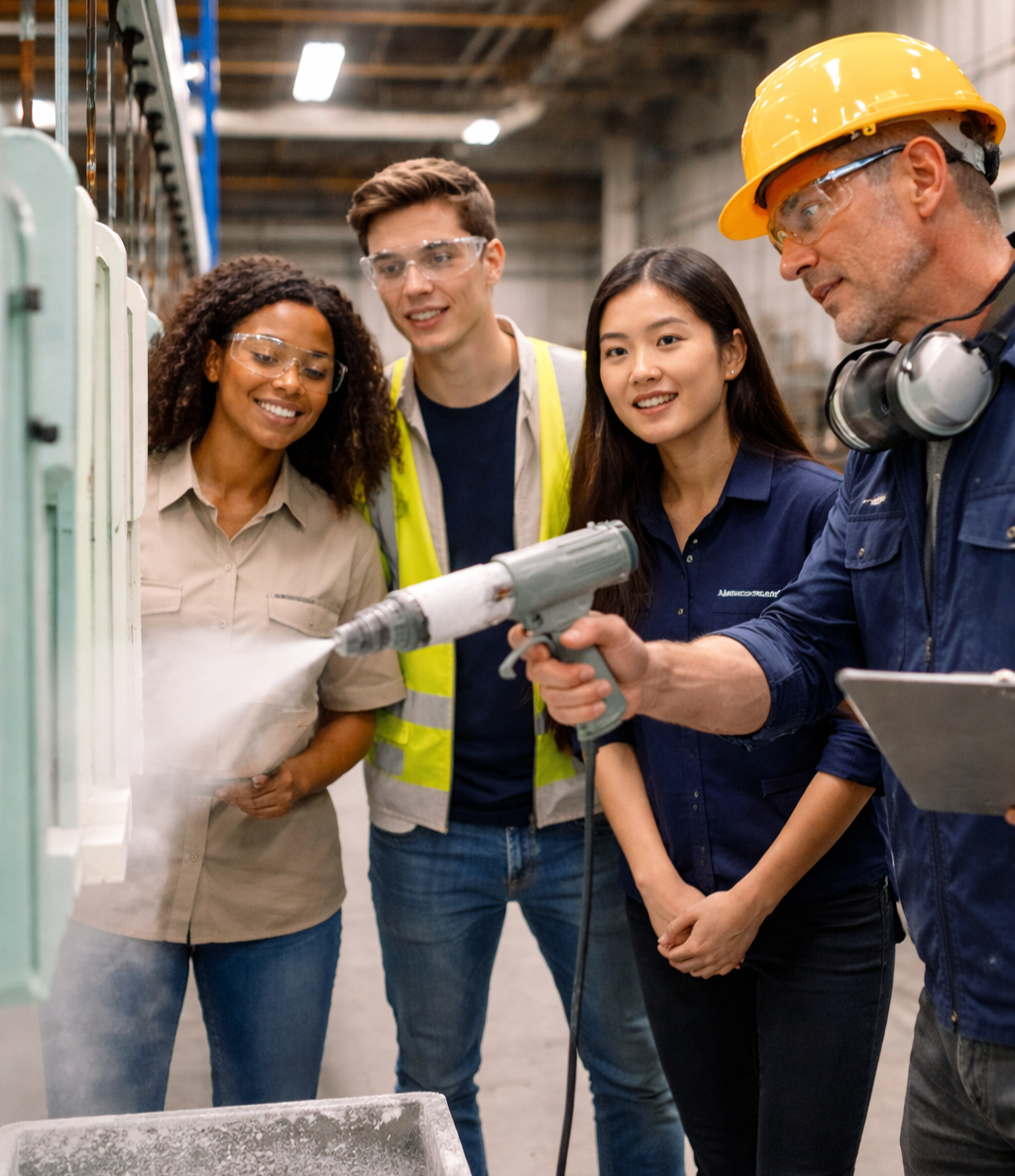 Rather than learning only from textbooks, participants are exposed to the actual operations behind aluminium fabrication, powder coating, and architectural construction supply.